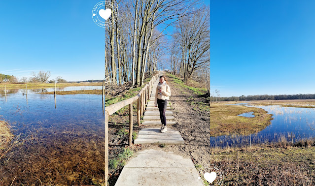 We wandelde verder en zagen op een bordje `vissteiger` staan. Ik ben dol op vlonderpaden, dus ik dacht, wie weet is dat wel een fotogeniek plekje, zo`n steiger. We wandelde richting de vissteiger en kwamen bij een geheel vernieuwd aangelegd wandelomgeving. We wandelde over een brug die ons naar de vissteiger zou leiden, maar die hield opeens op vanwege het hoge water. De vissteiger stond compleet onder water en niet een klein beetje, alleen de reling stond nog boven het water. Waar de watervogels heerlijk gebruik van maakte en er bovenop zaten. Zo`n leuk gezicht. We wandelde terug en ontdekte ik een trap naar een uitkijkpunt. Eenmaal boven aangekomen hadden we prachtig zicht op het Laarder Wasmeer. Echt prachtig om te zien, zo genieten. Ik had warme thee mee, dus schonk ik in het meegenomen Bunzlau Castle servies de thee in. De eerste picknick in de natuur in januari, zo leuk! Het waaide wel hard daar bovenop die berg, dus de picknick was van korte duur, we vervolgde onze weg.