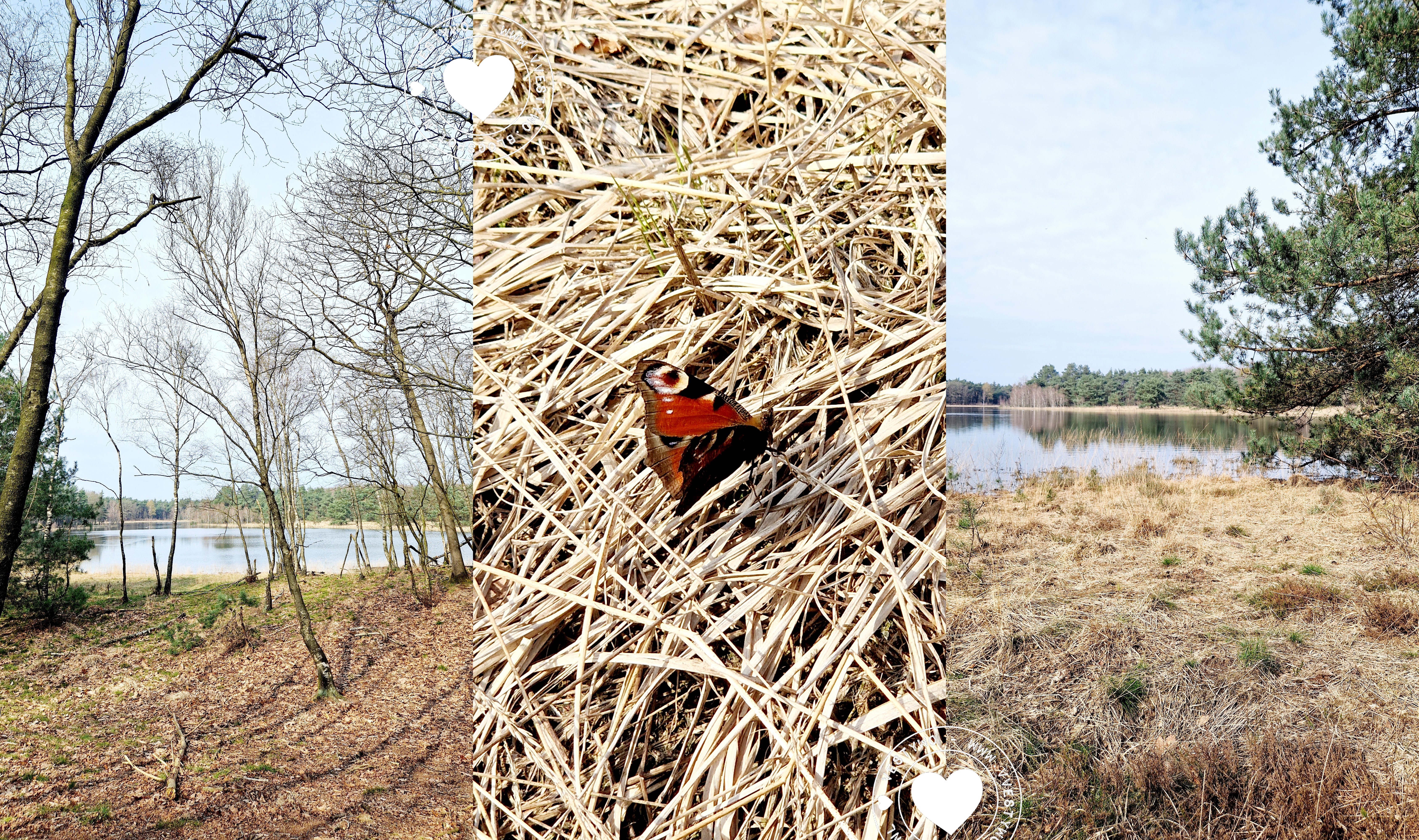 We wandelden eerst naar links, picknickte bij een picknickbankje (waar je dus ook kan oversteken, maar wederom door de vele regenval het wandelpad niet begaanbaar was) en waar nichtje de enen boom na de andere inklom. Hier en daar fladderde een wit vlindertje. We vervolgde het pad en kwamen aan de andere kant van de waterplas, hier vlogen de dagpauwoog vlinders af en aan. Ze rusten op de grond in de zon, waarnaar ze weer opstegen. We zagen paringsdansjes in de lucht en hoorde ze fladderen om ons heen. Een wonderlijk moment, er ging er zelfs één bij zuslief op de jas zitten. Zo gaaf. Die dag startte de lente en dat was merkbaar, het was warm en het zonnetje scheen heerlijk. Zo genoten.