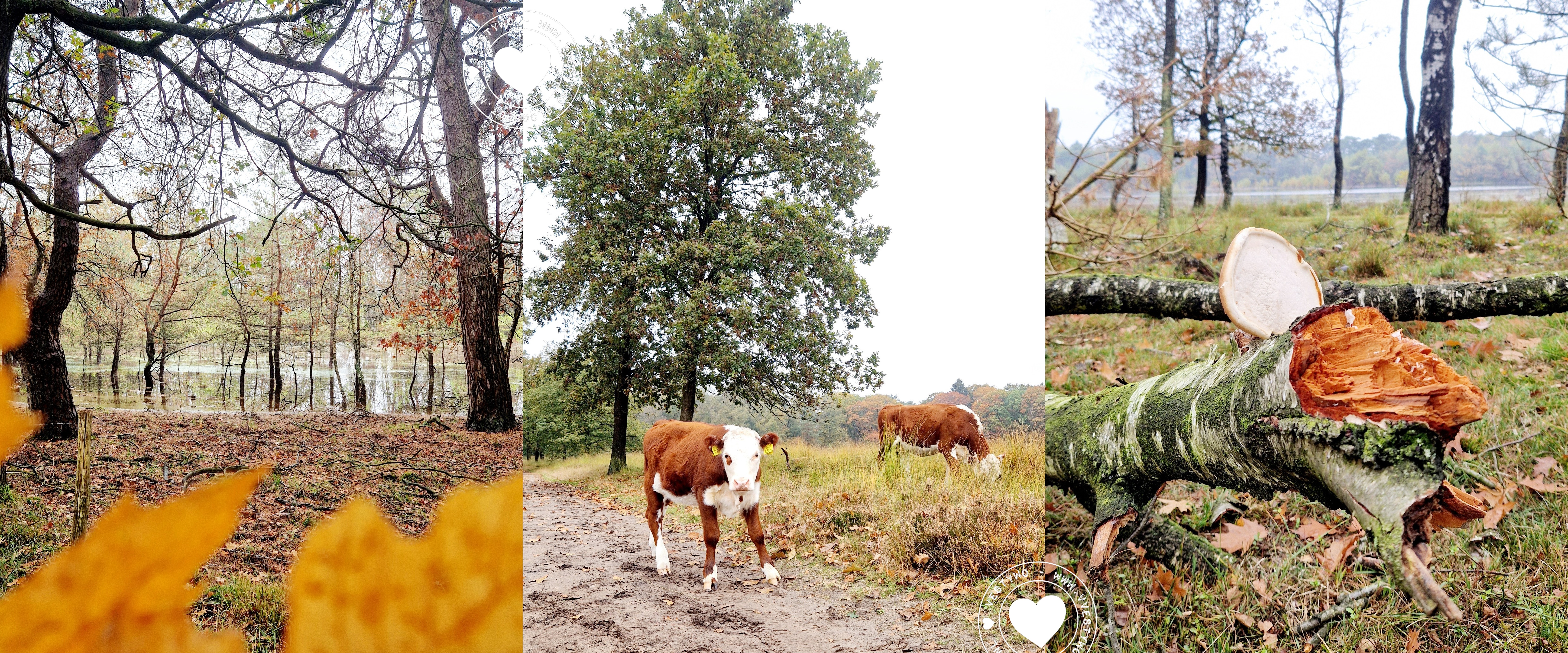 We wandelden door een, toen nog, groen bos en opeens was daar de herfst, knalgeel en oranjeboven voerden de boventoon. Kleuren die zo prachtig in elkaar blenden, we schopten de bladeren onder onze voeten hoog op. Hier en daar zagen we paddenstoelen. Super veel paddenstoelen, in verschillende soorten en maten. Zo bijzonder. Van veraf zagen we onderstaande paddenstoel (rechts) op de boom zitten, we dachten samen `wat zou dat daar toch zijn?` Het bleek een paddenstoel te staan die fier rechtop groeiden op een neergehaalde boomstam. Ook was er water, heel veel water, een wandelpad was daardoor niet begaanbaar, we wandelden verder om de Leersumse Plassen heen. Het leek wel een moeras, zo nat was het.